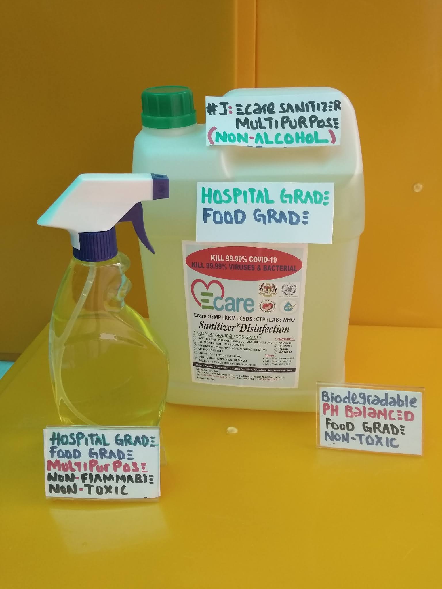 OUR ECARE SANITIZER MULTIPURPOSE AS SANITIZING, DISINFECTION, CONTAMINATION IS APPROVED BY KEMENTERIAN KESIHATAN MALAYSIA : KKM :AS ALL IN ONE PRODUCT AT HOSPITAL GRADE + FOOD GRADE .NON-FLAMMABLE : NON-TOXIC :MORE SAFETY : SANITIZER :